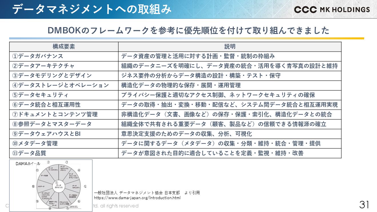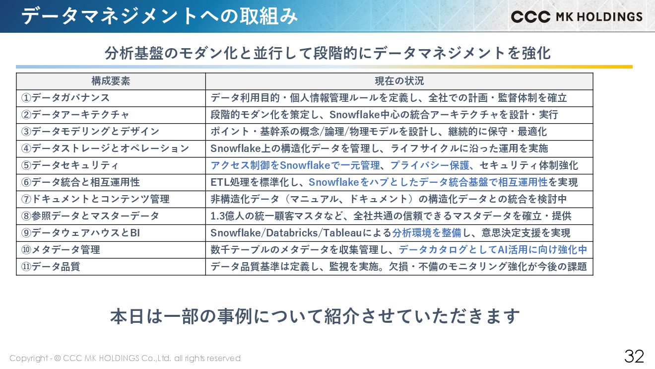 31 データマネジメントへの取組み DMBOKのフレームワークを参考に優先順位を付けて取り組んできました 構成要素 説明 ①データガバナンス データ資産の管理と活用に対する計画・監督・統制の枠組み ②データアーキテクチャ 組織のデータニーズを明確にし、データ資産の統合・活用を導く青写真の設計と維持 ③データモデリングとデザイン ジネス要件の分析からデータ構造の設計・構築・テスト・保守 ④データストレージとオペレーション 構造化データの物理的な保存・展開・運用管理 ⑤データセキュリティ プライバシー保護と適切なアクセス制御、ネットワークセキュリティの確保 ⑥データ統合と相互運用性 データの取得・抽出・変換・移動・配信など、システム間データ統合と相互運用実現 ⑦ドキュメントとコンテンツ管理 非構造化データ(文書、画像など)の保存・保護・索引化、構造化データとの統合 ⑧参照データとマスターデータ 組織全体で共有される重要データ(顧客、製品など)の信頼できる情報源の確立 ⑨データウェアハウスとBI 意思決定支援のためのデータの収集、分析、可視化 ⑩メタデータ管理 データに関するデータ(メタデータ)の収集・分類・維持・統合・管理・提供 ⑪データ品質 データが意図された目的に適合していることを定義・監視・維持・改善 一般社団法人 データマネジメント協会 日本支部 より引用 https://www.dama-japan.org/Introduction.html