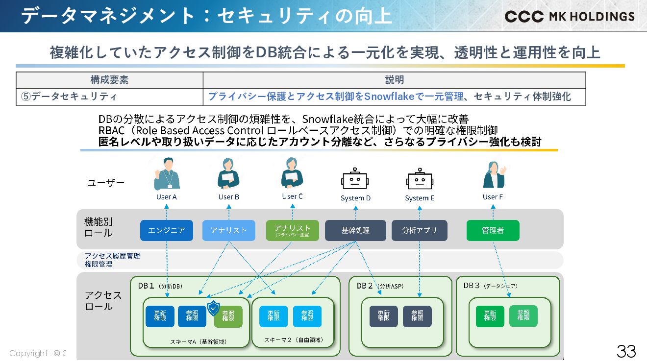 32 データマネジメントへの取組み 分析基盤のモダン化と並行して段階的にデータマネジメントを強化 構成要素 現在の状況 ①データガバナンス データ利用目的・個人情報管理ルールを定義し、全社での計画・監督体制を確立 ②データアーキテクチャ 段階的モダン化を策定し、Snowflake中心の統合アーキテクチャを設計・実行 ③データモデリングとデザイン ポイント・基幹系の概念/論理/物理モデルを設計し、継続的に保守・最適化 ④データストレージとオペレーション Snowflake上の構造化データを管理し、ライフサイクルに沿った運用を実施 ⑤データセキュリティ アクセス制御をSnowflakeで一元管理、プライバシー保護、セキュリティ体制強化 ⑥データ統合と相互運用性 ETL処理を標準化し、Snowflakeをハブとしたデータ統合基盤で相互運用性を実現 ⑦ドキュメントとコンテンツ管理 非構造化データ(マニュアル、ドキュメント)の構造化データとの統合を検討中 ⑧参照データとマスターデータ 1.3億人の統一顧客マスタなど、全社共通の信頼できるマスタデータを確立・提供 ⑨データウェアハウスとBI Snowflake/Databricks/Tableauによる分析環境を整備し、意思決定支援を実現 ⑩メタデータ管理 数千テーブルのメタデータを収集管理し、データカタログとしてAI活用に向け強化中 ⑪データ品質 データ品質基準は定義し、監視を実施。欠損・不備のモニタリング強化が今後の課題 本日は一部の事例について紹介させていただきます