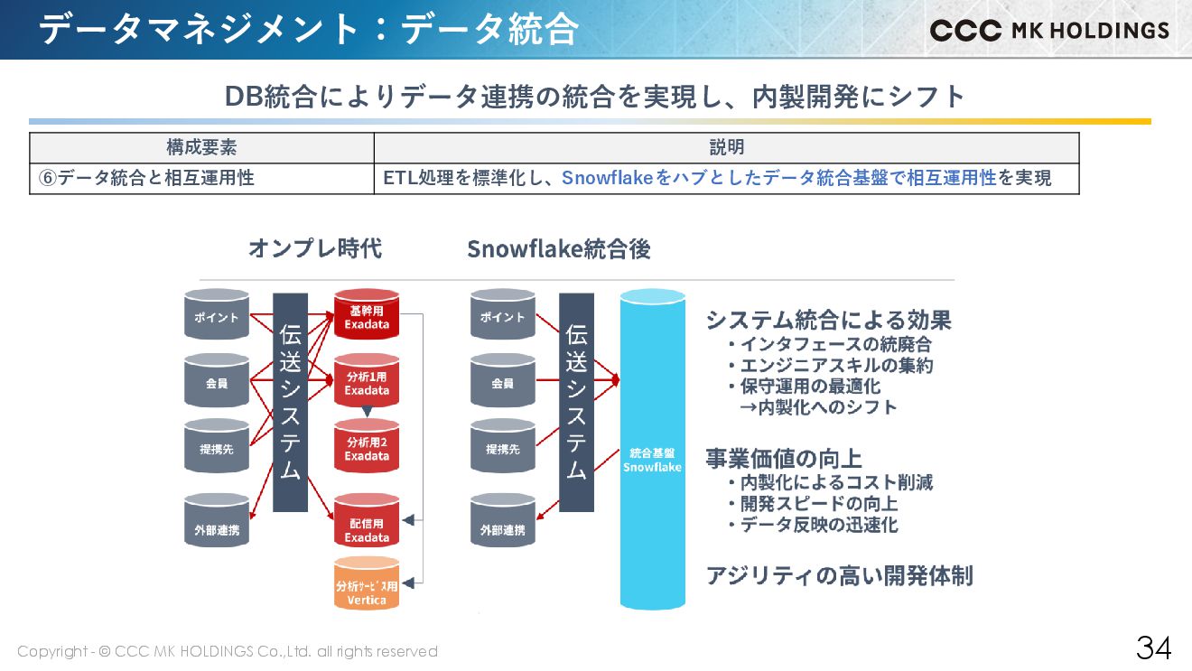 34 データマネジメント:データ統合 DB統合によりデータ連携の統合を実現し、内製開発にシフト 構成要素 説明 ⑥データ統合と相互運用性 ETL処理を標準化し、Snowflakeをハブとしたデータ統合基盤で相互運用性を実現