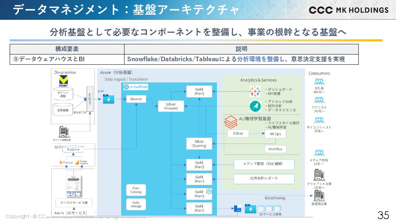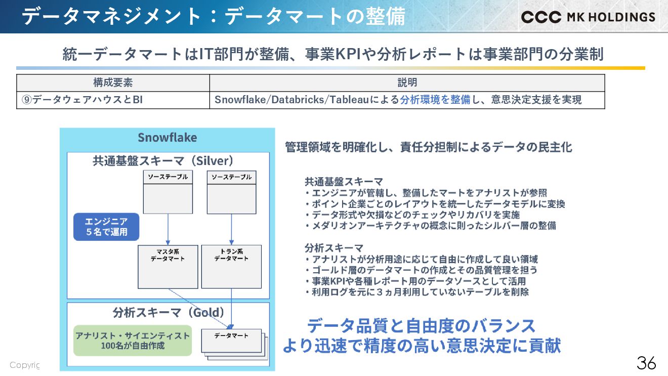 35 データマネジメント:基盤アーキテクチャ 分析基盤として必要なコンポーネントを整備し、事業の根幹となる基盤へ 構成要素 説明 ⑨データウェアハウスとBI Snowflake/Databricks/Tableauによる分析環境を整備し、意思決定支援を実現
