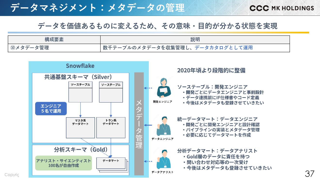 37 データマネジメント:メタデータの管理 構成要素 説明 ⑩メタデータ管理 数千テーブルのメタデータを収集管理し、データカタログとして運用 データを価値あるものに変えるため、その意味・目的が分かる状態を実現