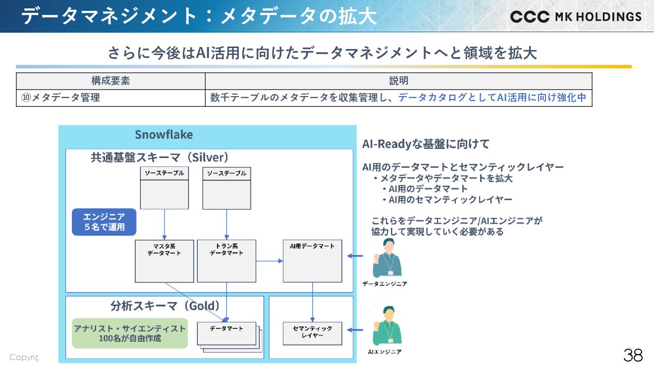 38 データマネジメント:メタデータの拡大 構成要素 説明 ⑩メタデータ管理 数千テーブルのメタデータを収集管理し、データカタログとしてAI活用に向け強化中 さらに今後はAI活用に向けたデータマネジメントへと領域を拡大
