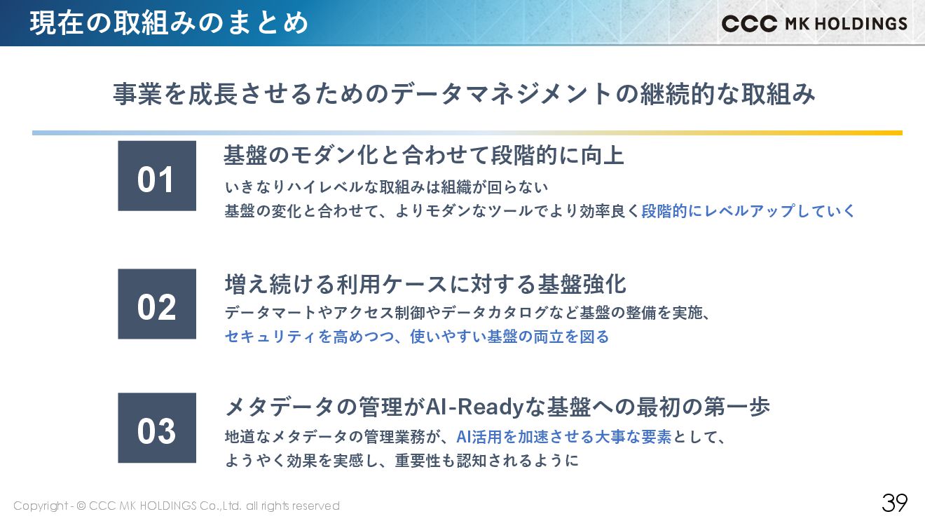 39 現在の取組みのまとめ 03 メタデータの管理がAI-Readyな基盤への最初の第一歩 02 増え続ける利用ケースに対する基盤強化 データマートやアクセス制御やデータカタログなど基盤の整備を実施、 セキュリティを高めつつ、使いやすい基盤の両立を図る 01 基盤のモダン化と合わせて段階的に向上 いきなりハイレベルな取組みは組織が回らない 基盤の変化と合わせて、よりモダンなツールでより効率良く段階的にレベルアップしていく 事業を成長させるためのデータマネジメントの継続的な取組み 地道なメタデータの管理業務が、AI活用を加速させる大事な要素として、 ようやく効果を実感し、重要性も認知されるように