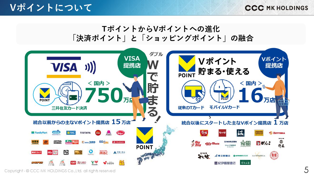 5 Vポイントについて 5 750 万店 16 万店 VISA 提携店 Vポイント 提携店 従来のTカード モバイルVカード 三井住友カード決済 W で 貯 ま る ダブル < 国内 > < 国内 > TポイントからVポイントへの進化 「決済ポイント」と「ショッピングポイント」の融合 統合以前からの主なVポイント提携店 15 万店 統合以後にスタートした主なVポイン提携店 1 万店