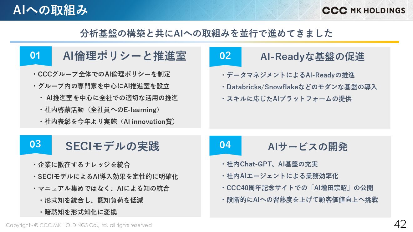 42 分析基盤の構築と共にAIへの取組みを並行で進めてきました 01 AI倫理ポリシーと推進室 ・CCCグループ全体でのAI倫理ポリシーを制定 ・グループ内の専門家を中心にAI推進室を設立 ・ AI推進室を中心に全社での適切な活用の推進 ・社内啓蒙活動(全社員へのE-learning) ・社内表彰を今年より実施(AI innovation賞) 03 SECIモデルの実践 ・企業に散在するナレッジを統合 ・SECIモデルによるAI導入効果を定性的に明確化 ・マニュアル集めではなく、AIによる知の統合 ・形式知を統合し、認知負荷を低減 ・暗黙知を形式知化に変換 02 AI-Readyな基盤の促進 ・データマネジメントによるAI-Readyの推進 ・Databricks/Snowflakeなどのモダンな基盤の導入 ・スキルに応じたAIプラットフォームの提供 04 AIサービスの開発 ・社内Chat-GPT、AI基盤の充実 ・社内AIエージェントによる業務効率化 ・CCC40周年記念サイトでの「AI増田宗昭」の公開 ・段階的にAIへの習熟度を上げて顧客価値向上へ挑戦 AIへの取組み