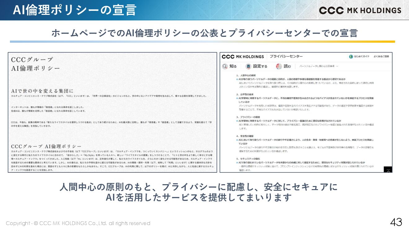 43 AI倫理ポリシーの宣言 ホームページでのAI倫理ポリシーの公表とプライバシーセンターでの宣言 人間中心の原則のもと、プライバシーに配慮し、安全にセキュアに AIを活用したサービスを提供してまいります