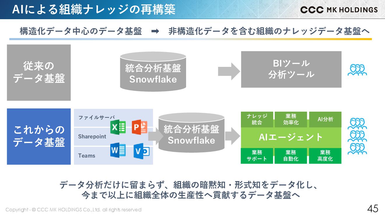 45 AIによる組織ナレッジの再構築 構造化データ中心のデータ基盤 非構造化データを含む組織のナレッジデータ基盤へ 統合分析基盤 Snowflake BIツール 分析ツール ファイルサーバ Sharepoint Teams AIエージェント 従来の データ基盤 これからの データ基盤 データ分析だけに留まらず、組織の暗黙知・形式知をデータ化し、 今まで以上に組織全体の生産性へ貢献するデータ基盤へ 業務 サポート 業務 自動化 業務 高度化 ナレッジ 統合 業務 効率化 AI分析 統合分析基盤 Snowflake