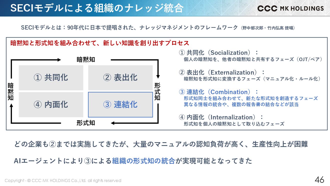 46 SECIモデルによる組織のナレッジ統合 SECIモデルとは:90年代に日本で提唱された、ナレッジマネジメントのフレームワーク(野中郁次郎・竹内弘高 提唱) ① 共同化 ② 表出化 ④ 内面化 ③ 連結化 暗 黙 知 形 式 知 暗黙知 形式知 暗黙知と形式知を組み合わせて、新しい知識を創り出すプロセス ① 共同化(Socialization): 個人の暗黙知を、他者の暗黙知と共有するフェーズ(OJT/ペア) ② 表出化(Externalization): 暗黙知を形式知に変換するフェーズ(マニュアル化・ルール化) ③ 連結化(Combination): 形式知同士を組み合わせて、新たな形式知を創造するフェーズ 異なる情報の統合や、複数の報告書の結合などが該当 ④ 内面化(Internalization): 形式知を個人の暗黙知として取り込むフェーズ どの企業も②までは実施してきたが、大量のマニュアルの認知負荷が高く、生産性向上が困難 AIエージェントにより③による組織の形式知の統合が実現可能となってきた