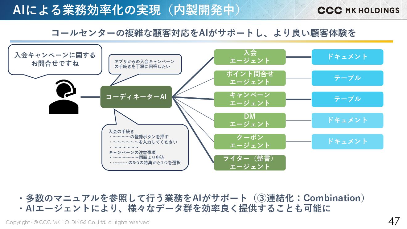 47 AIによる業務効率化の実現(内製開発中) コーディネーターAI コールセンターの複雑な顧客対応をAIがサポートし、より良い顧客体験を 入会 エージェント ポイント問合せ エージェント キャンペーン エージェント DM エージェント クーポン エージェント ライター(整書) エージェント ドキュメント テーブル テーブル ドキュメント ドキュメント ・多数のマニュアルを参照して行う業務をAIがサポート(③連結化:Combination) ・AIエージェントにより、様々なデータ群を効率良く提供することも可能に 入会キャンペーンに関する お問合せですね 入会の手続き ・~~~~の登録ボタンを押す ・~~~~~~を入力してください ・~~~~~~ キャンペーンの注意事項 ・~~~~~~画面より申込 ・~~~~~の3つの特典から1つを選択 アプリからの入会キャンペーン の手続きを丁寧に回答したい