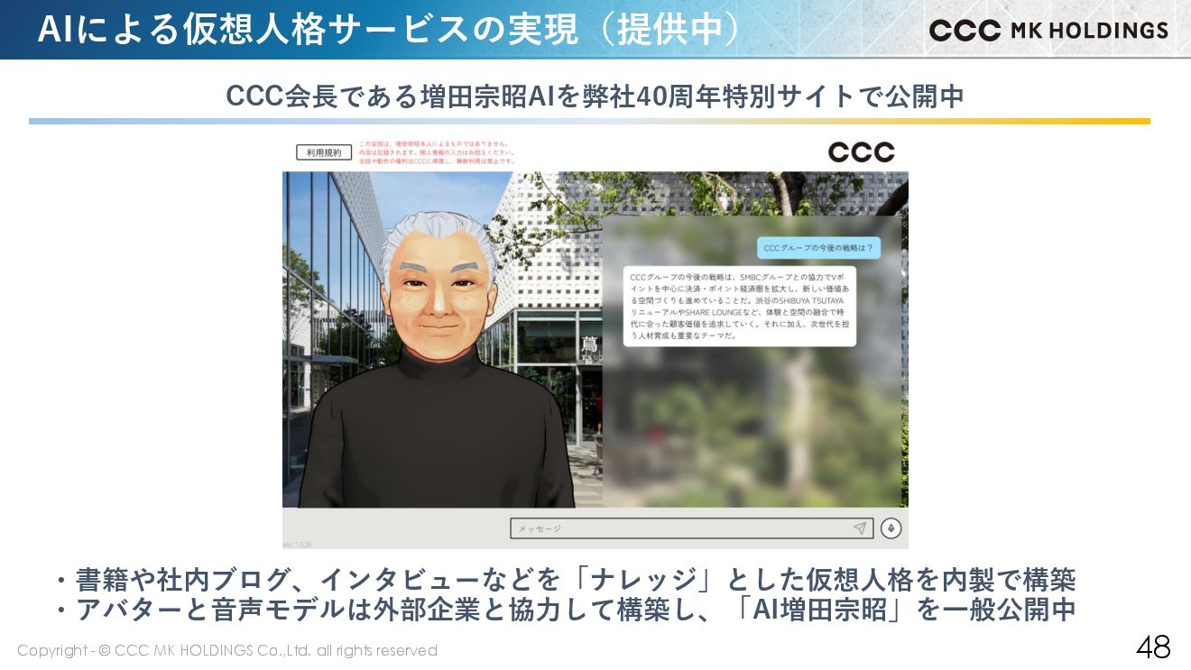48 AIによる仮想人格サービスの実現(提供中) CCC会長である増田宗昭AIを弊社40周年特別サイトで公開中 ・書籍や社内ブログ、インタビューなどを「ナレッジ」とした仮想人格を内製で構築 ・アバターと音声モデルは外部企業と協力して構築し、「AI増田宗昭」を一般公開中