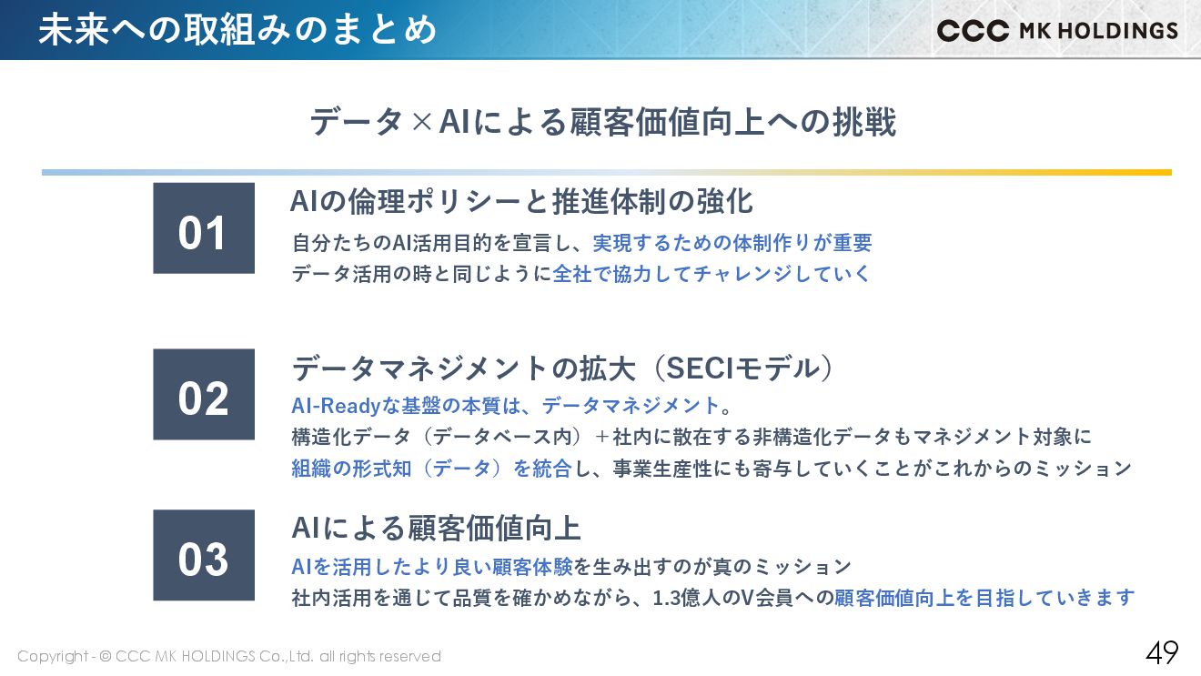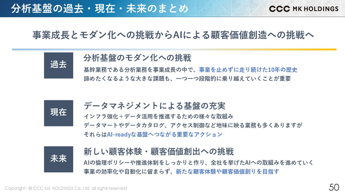 49 未来への取組みのまとめ 03 AIによる顧客価値向上 02 データマネジメントの拡大(SECIモデル) AI-Readyな基盤の本質は、データマネジメント。 構造化データ(データベース内)+社内に散在する非構造化データもマネジメント対象に 組織の形式知(データ)を統合し、事業生産性にも寄与していくことがこれからのミッション 01 AIの倫理ポリシーと推進体制の強化 自分たちのAI活用目的を宣言し、実現するための体制作りが重要 データ活用の時と同じように全社で協力してチャレンジしていく データ×AIによる顧客価値向上への挑戦 AIを活用したより良い顧客体験を生み出すのが真のミッション 社内活用を通じて品質を確かめながら、1.3億人のV会員への顧客価値向上を目指していきます