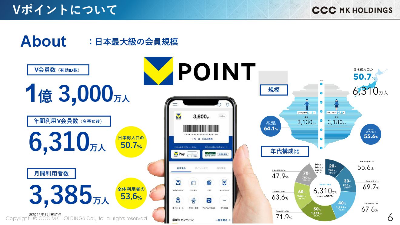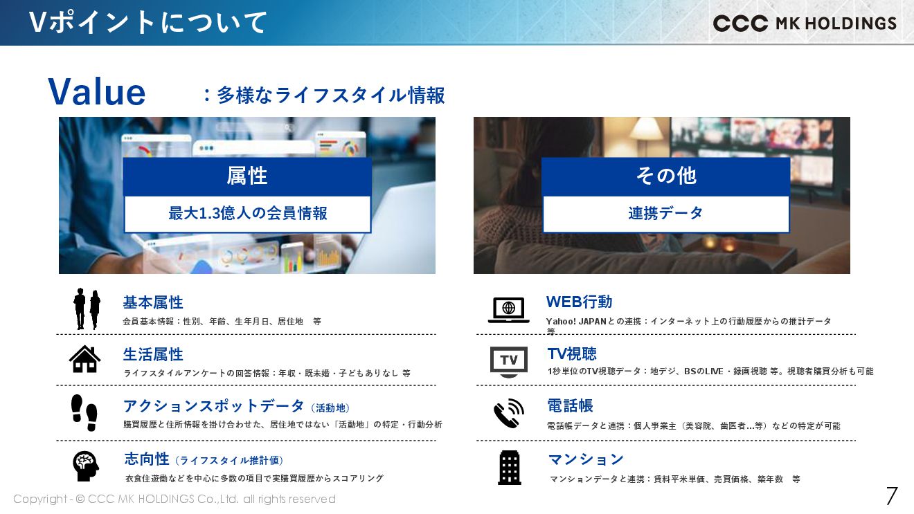 6 About Vポイントについて 6 :日本最大級の会員規模 年代構成比 年間利用V会員数(名寄せ後) V会員数(有効ID数) 1億 3,000 万人 6,310 万人 月間利用者数 3,385 万人 規模 全体利用者の 53.6% 日本総人口の 50.7% ※2024年7月末時点