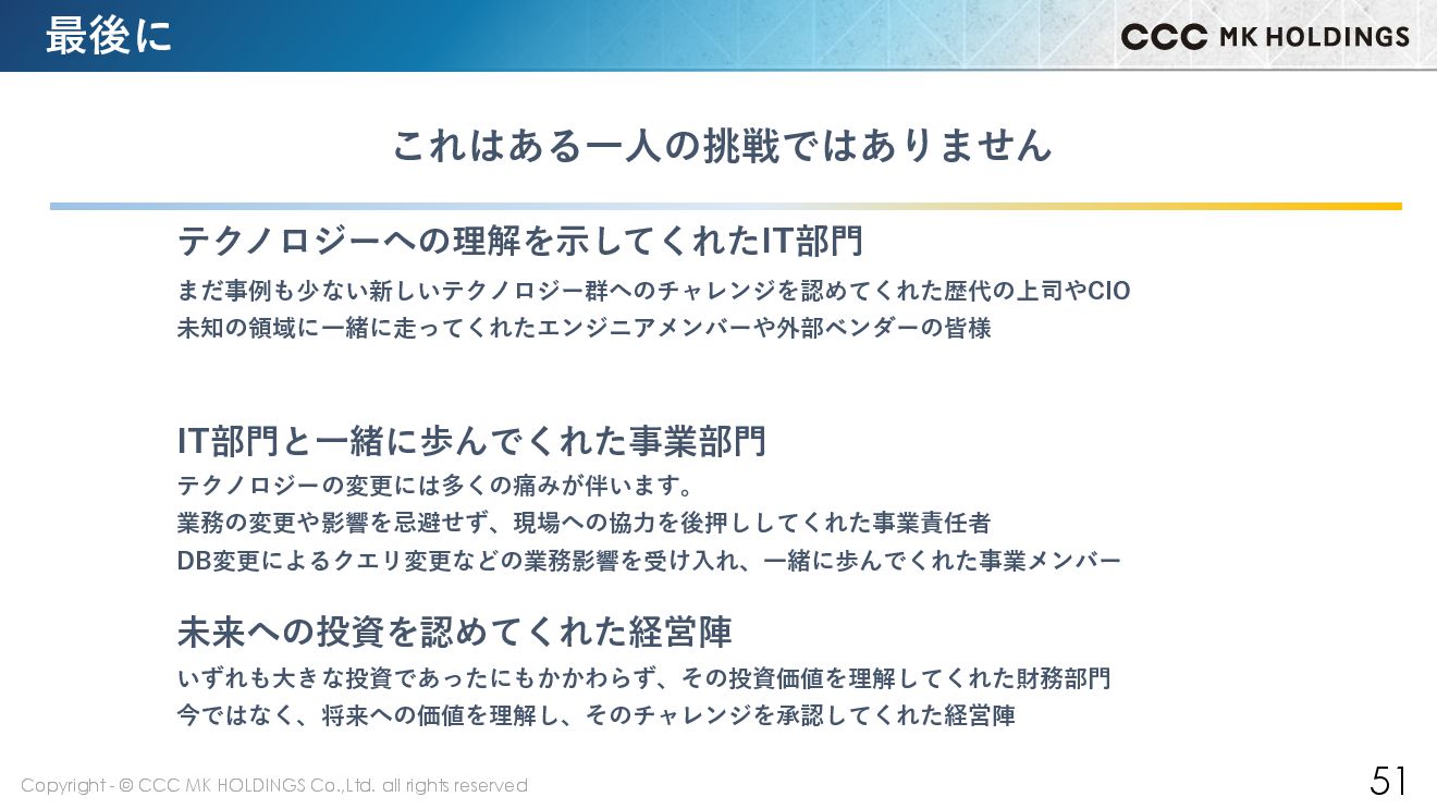 51 最後に 未来への投資を認めてくれた経営陣 IT部門と一緒に歩んでくれた事業部門 テクノロジーの変更には多くの痛みが伴います。 業務の変更や影響を忌避せず、現場への協力を後押ししてくれた事業責任者 DB変更によるクエリ変更などの業務影響を受け入れ、一緒に歩んでくれた事業メンバー テクノロジーへの理解を示してくれたIT部門 まだ事例も少ない新しいテクノロジー群へのチャレンジを認めてくれた歴代の上司やCIO 未知の領域に一緒に走ってくれたエンジニアメンバーや外部ベンダーの皆様 これはある一人の挑戦ではありません いずれも大きな投資であったにもかかわらず、その投資価値を理解してくれた財務部門 今ではなく、将来への価値を理解し、そのチャレンジを承認してくれた経営陣