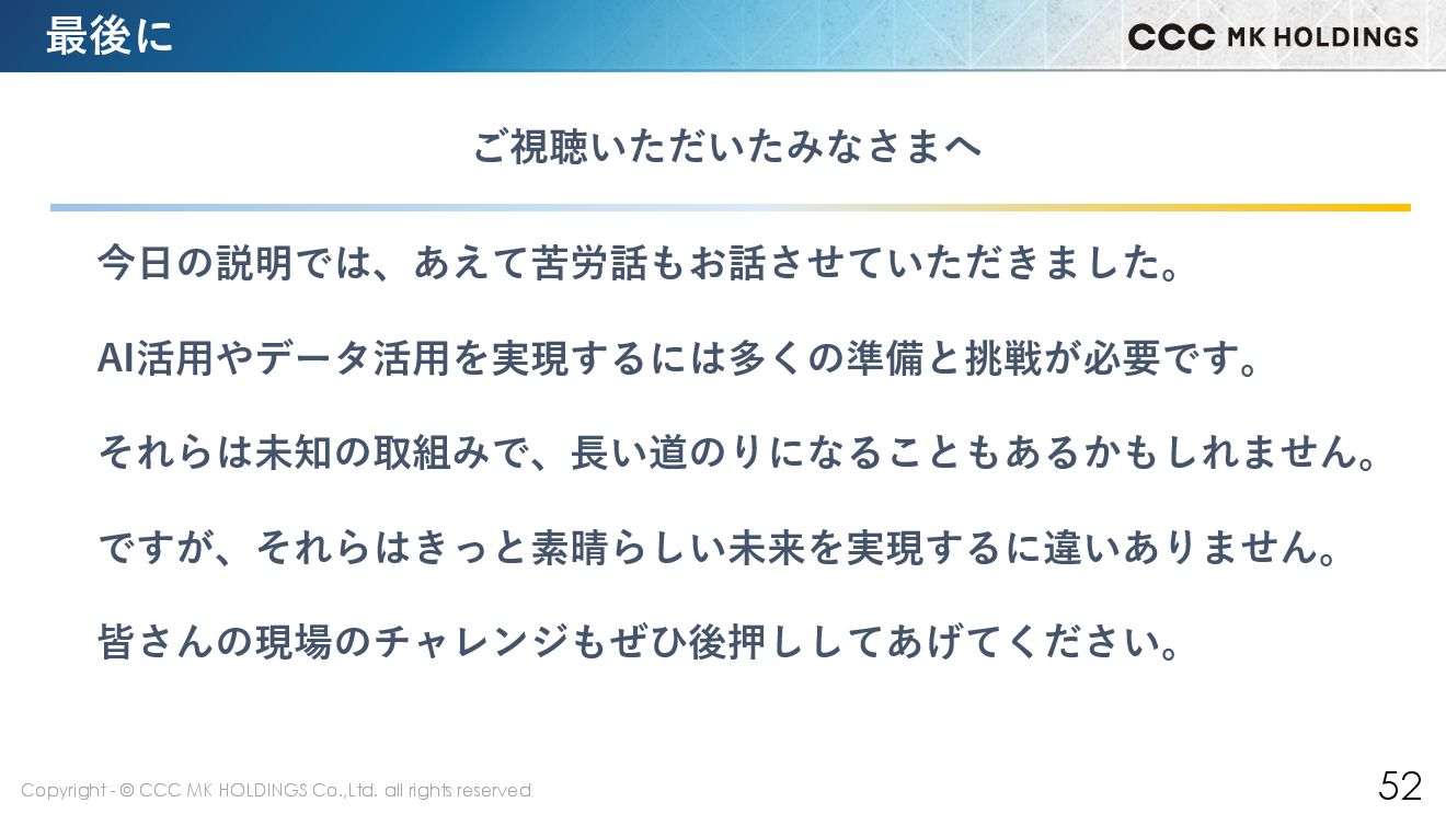 52 最後に ご視聴いただいたみなさまへ 今日の説明では、あえて苦労話もお話させていただきました。 AI活用やデータ活用を実現するには多くの準備と挑戦が必要です。 それらは未知の取組みで、長い道のりになることもあるかもしれません。 ですが、それらはきっと素晴らしい未来を実現するに違いありません。 皆さんの現場のチャレンジもぜひ後押ししてあげてください。