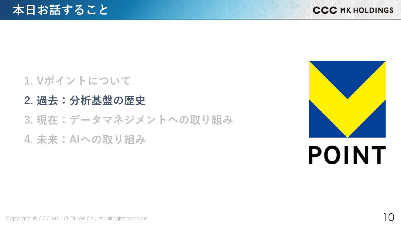 10 本日お話すること 1. Vポイントについて 2. 過去:分析基盤の歴史 3. 現在:データマネジメントへの取り組み 4. 未来:AIへの取り組み