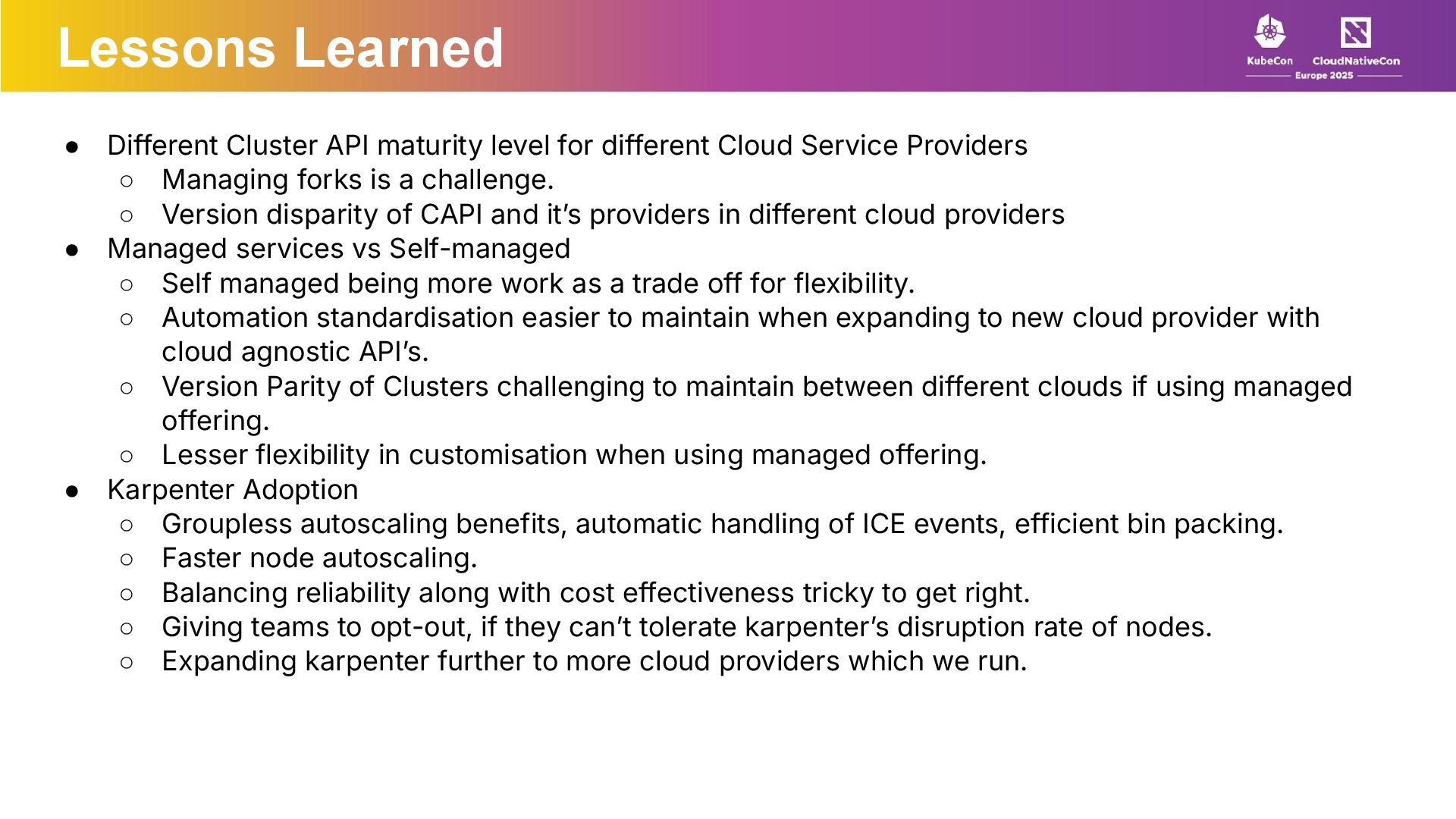 We'll explore how Cluster API facilitates seamless automation of cluster creation and management across our multi-cloud setup, upgrades, enhancing autonomy and resilience. Moreover, we'll highlight real-world use cases sharing our learnings from automation built for efficient management of k8s clusters while limiting operational overhead.