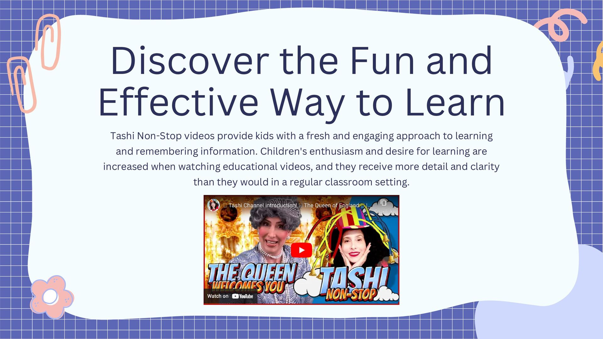 Transform your learning experience with Tashi Non-Stop! Our fun and engaging videos make learning fun and enjoyable for everyone. With our interactive videos, you can learn in a way that fits your unique style, helping you retain more information in the process. Whether it's math, science, history or any other topic, Making Learning Fun is the perfect way to make learning a piece of cake.