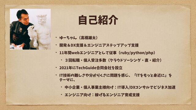 自己紹介 ゆーちゃん(高橋雄太) 開発&DX支援&エンジニアステップアップ支援 11年間webエンジニアとして従事(ruby/python/php) 3回転職・個人受注多数(クラウドソーシング・直・紹介) 2021年にTechGuide合同会社を設立 IT技術の難しさや分かりくさに問題を感じ、「ITをもっと身近に」を テーマに、 中小企業・個人事業主様向け:IT導入/DXコンサルでビジネス加速 エンジニア向け:稼げるエンジニア育成支援