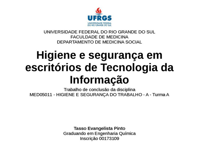 DEPARTAMENTO DE MEDICINA SOCIAL Higiene e segurança em escritórios de Tecnologia da Informação Trabalho de conclusão da disciplina MED05011 - HIGIENE E SEGURANÇA DO TRABALHO - A - Turma A Tasso Evangelista Pinto Graduando em Engenharia Química Inscrição 00173109