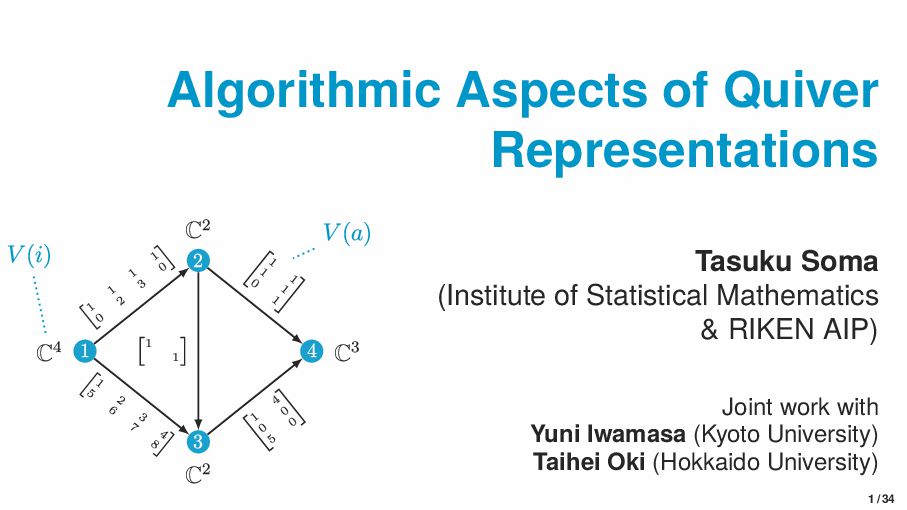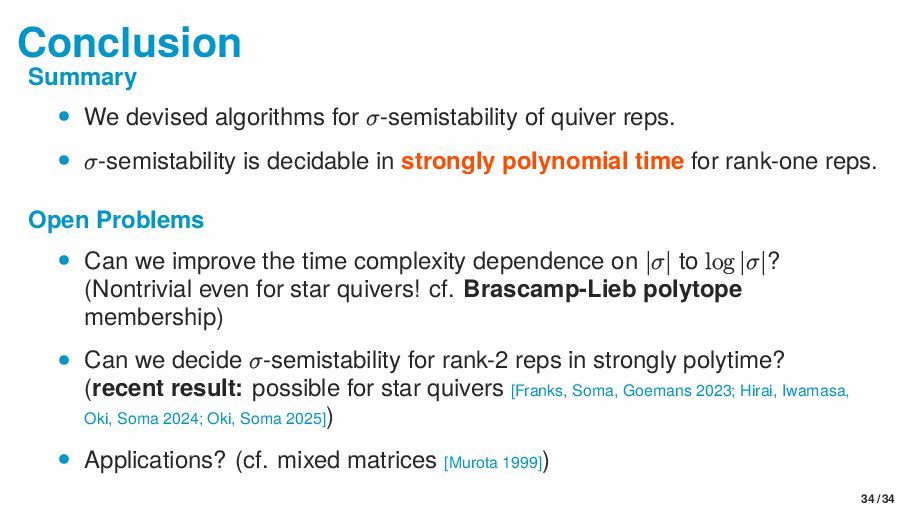 reps. • σ-semistability is decidable in strongly polynomial time for rank-one reps. Open Problems • Can we improve the time complexity dependence on |σ| to log |σ|? (Nontrivial even for star quivers! cf. Brascamp-Lieb polytope membership) • Can we decide σ-semistability for rank-2 reps in strongly polytime? (recent result: possible for star quivers [Franks, Soma, Goemans 2023; Hirai, Iwamasa, Oki, Soma 2024; Oki, Soma 2025]) • Applications? (cf. mixed matrices [Murota 1999]) 34 / 34