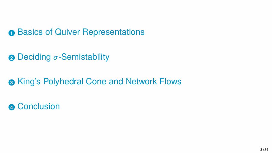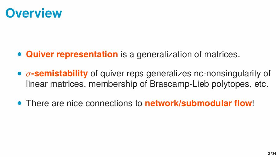 σ-semistability of quiver reps generalizes nc-nonsingularity of linear matrices, membership of Brascamp-Lieb polytopes, etc. • There are nice connections to network/submodular flow! 2 / 34