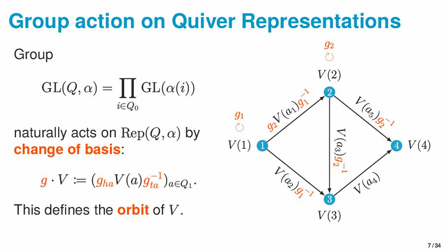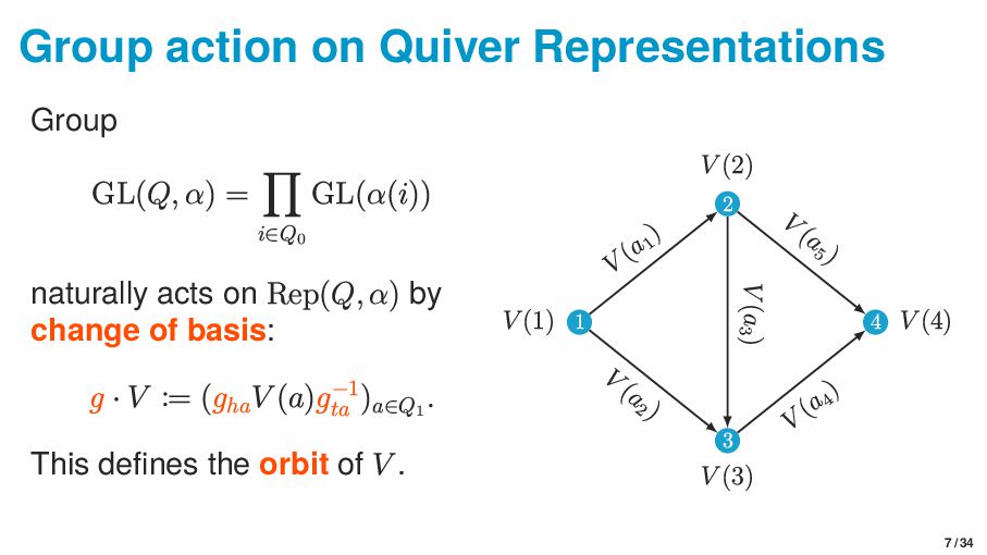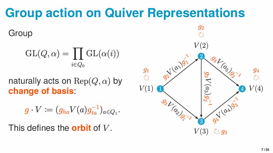 GL(α(i)) naturally acts on Rep(Q, α) by change of basis: g · V := (gha V (a)g−1 ta )a∈Q1 . This defines the orbit of V . 1 2 3 4 V (a1 )g − 1 1 V (a 2 )g − 1 1 V (a3 ) V (a4 ) V (a 5 ) V (1) V (2) V (3) V (4) g1 ⟳ g2 ⟳ g4 ⟳ ⟳ g3 7 / 34