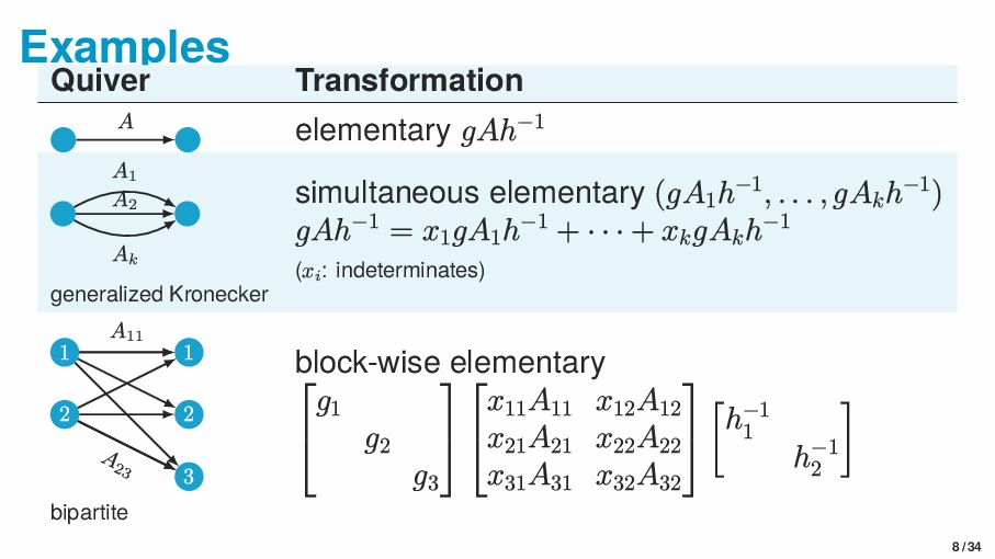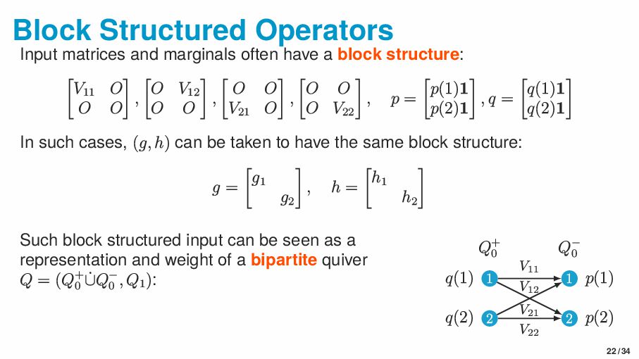 block structure: V11 O O O , O V12 O O , O O V21 O , O O O V22 , p = p(1)1 p(2)1 , q = q(1)1 q(2)1 In such cases, (g, h) can be taken to have the same block structure: g = g1 g2 , h = h1 h2 Such block structured input can be seen as a representation and weight of a bipartite quiver Q = (Q+ 0 ˙ ∪Q− 0 , Q1 ): 1 2 1 2 q(1) q(2) p(1) p(2) Q+ 0 Q− 0 V11 V12 V21 V22 22 / 34