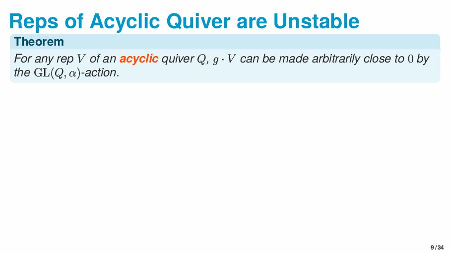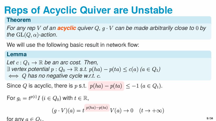 V of an acyclic quiver Q, g · V can be made arbitrarily close to 0 by the GL(Q, α)-action. We will use the following basic result in network flow: Lemma Let c : Q1 → R be an arc cost. Then, ∃ vertex potential p : Q0 → R s.t. p(ha) − p(ta) ≤ c(a) (a ∈ Q1 ) ⇐⇒ Q has no negative cycle w.r.t. c. Since Q is acyclic, there is p s.t. p(ha) − p(ta) ≤ −1 (a ∈ Q1 ). For gi = tp(i)I (i ∈ Q0 ) with t ∈ R, (g · V )(a) = t p(ha)−p(ta) V (a) → 0 (t → +∞) 9 / 34