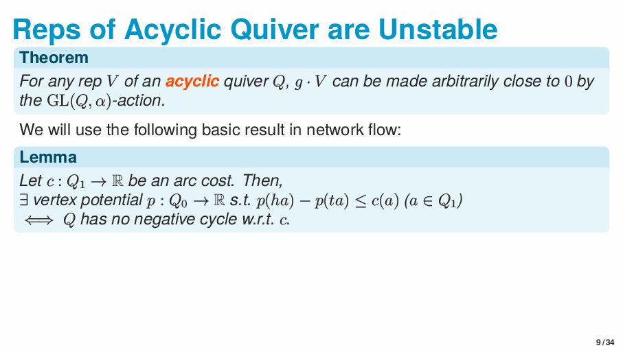 V of an acyclic quiver Q, g · V can be made arbitrarily close to 0 by the GL(Q, α)-action. We will use the following basic result in network flow: Lemma Let c : Q1 → R be an arc cost. Then, ∃ vertex potential p : Q0 → R s.t. p(ha) − p(ta) ≤ c(a) (a ∈ Q1 ) ⇐⇒ Q has no negative cycle w.r.t. c. 9 / 34