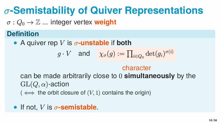 integer vertex weight Definition • A quiver rep V is σ-unstable if both g · V and χσ (g) := i∈Q0 det(gi )σ(i) character can be made arbitrarily close to 0 simultaneously by the GL(Q, α)-action ( ⇐⇒ the orbit closure of (V, 1) contains the origin) • If not, V is σ-semistable. 10 / 34