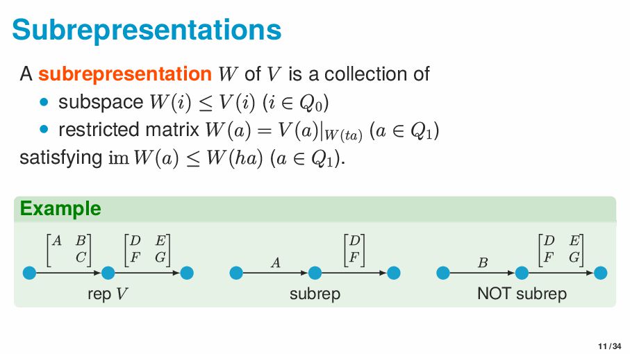• subspace W(i) ≤ V (i) (i ∈ Q0 ) • restricted matrix W(a) = V (a)|W(ta) (a ∈ Q1 ) satisfying im W(a) ≤ W(ha) (a ∈ Q1 ). Example A B C D E F G rep V A D F subrep B D E F G NOT subrep 11 / 34