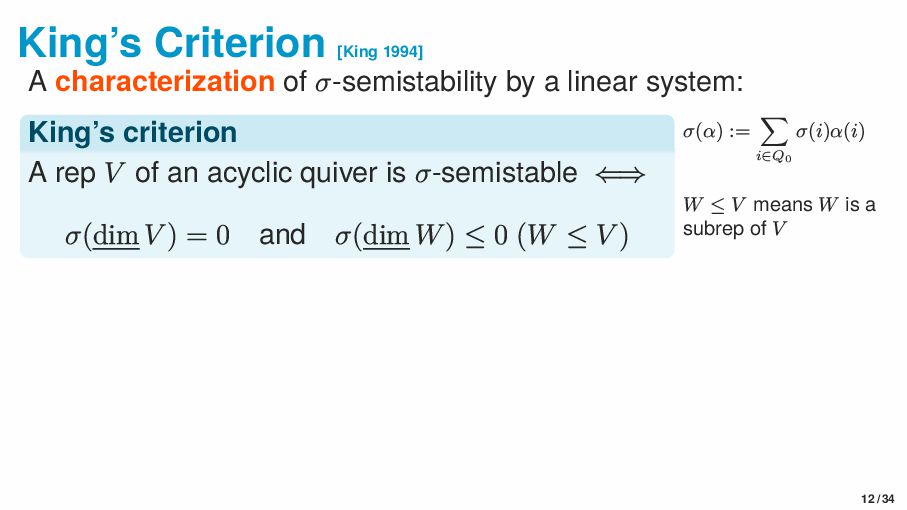 linear system: King’s criterion A rep V of an acyclic quiver is σ-semistable ⇐⇒ σ(dim V ) = 0 and σ(dim W) ≤ 0 (W ≤ V ) σ(α) := i∈Q0 σ(i)α(i) W ≤ V means W is a subrep of V 12 / 34