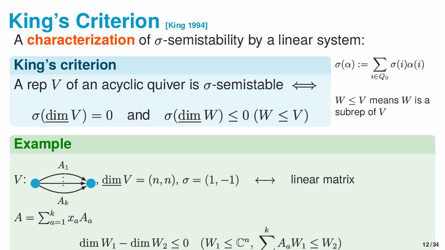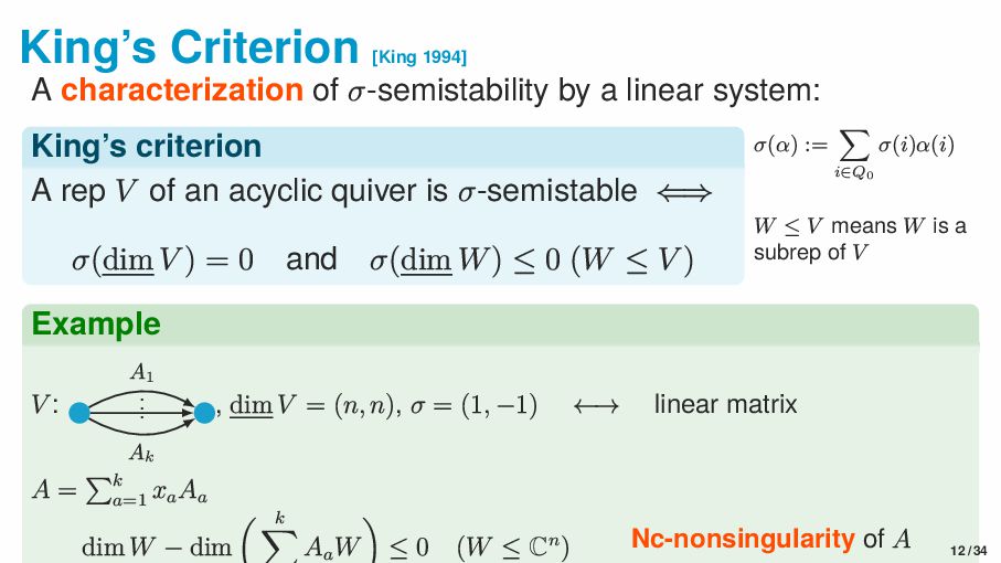 linear system: King’s criterion A rep V of an acyclic quiver is σ-semistable ⇐⇒ σ(dim V ) = 0 and σ(dim W) ≤ 0 (W ≤ V ) σ(α) := i∈Q0 σ(i)α(i) W ≤ V means W is a subrep of V Example V : A1 . . . Ak , dim V = (n, n), σ = (1, −1) ←→ linear matrix A = k a=1 xa Aa dim W − dim k Aa W ≤ 0 (W ≤ Cn) Nc-nonsingularity of A 12 / 34