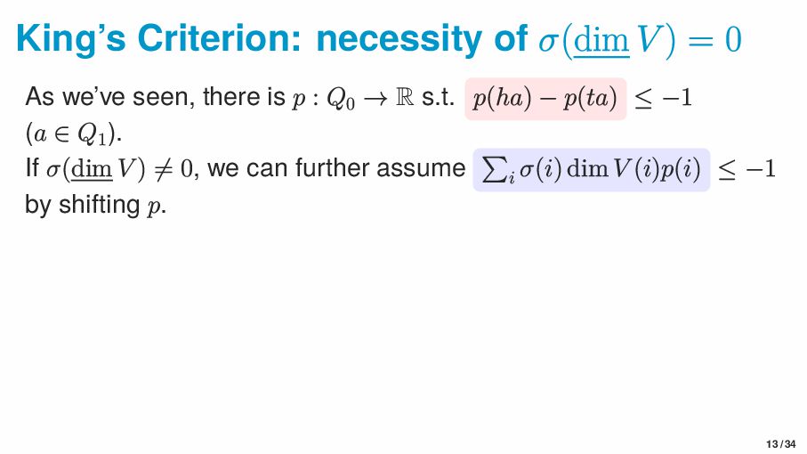 we’ve seen, there is p : Q0 → R s.t. p(ha) − p(ta) ≤ −1 (a ∈ Q1 ). If σ(dim V ) ̸= 0, we can further assume i σ(i) dim V (i)p(i) ≤ −1 by shifting p. 13 / 34
