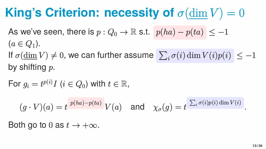 we’ve seen, there is p : Q0 → R s.t. p(ha) − p(ta) ≤ −1 (a ∈ Q1 ). If σ(dim V ) ̸= 0, we can further assume i σ(i) dim V (i)p(i) ≤ −1 by shifting p. For gi = tp(i)I (i ∈ Q0 ) with t ∈ R, (g · V )(a) = t p(ha)−p(ta) V (a) and χσ (g) = t i σ(i)p(i) dim V (i) . Both go to 0 as t → +∞. 13 / 34