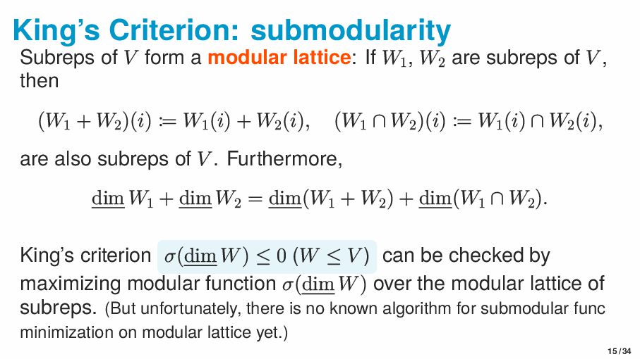 If W1 , W2 are subreps of V , then (W1 + W2 )(i) := W1 (i) + W2 (i), (W1 ∩ W2 )(i) := W1 (i) ∩ W2 (i), are also subreps of V . Furthermore, dim W1 + dim W2 = dim(W1 + W2 ) + dim(W1 ∩ W2 ). King’s criterion σ(dim W) ≤ 0 (W ≤ V ) can be checked by maximizing modular function σ(dim W) over the modular lattice of subreps. (But unfortunately, there is no known algorithm for submodular func minimization on modular lattice yet.) 15 / 34