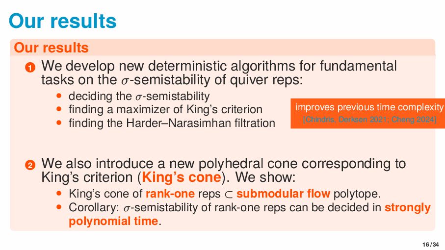 for fundamental tasks on the σ-semistability of quiver reps: • deciding the σ-semistability • finding a maximizer of King’s criterion • finding the Harder–Narasimhan filtration improves previous time complexity [Chindris, Derksen 2021; Cheng 2024] 2 We also introduce a new polyhedral cone corresponding to King’s criterion (King’s cone). We show: • King’s cone of rank-one reps ⊂ submodular flow polytope. • Corollary: σ-semistability of rank-one reps can be decided in strongly polynomial time. 16 / 34