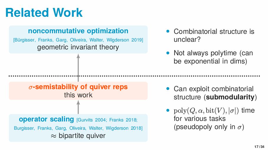 Garg, Oliveira, Walter, Wigderson 2018] ≈ bipartite quiver σ-semistability of quiver reps this work noncommutative optimization [Bürgisser, Franks, Garg, Oliveira, Walter, Wigderson 2019] geometric invariant theory • Combinatorial structure is unclear? • Not always polytime (can be exponential in dims) • Can exploit combinatorial structure (submodularity) • poly(Q, α, bit(V ), |σ|) time for various tasks (pseudopoly only in σ) 17 / 34