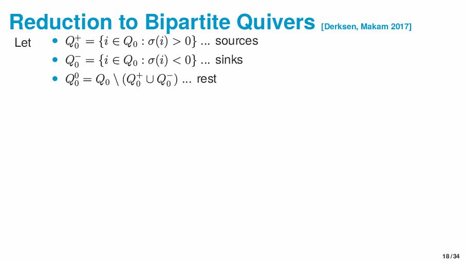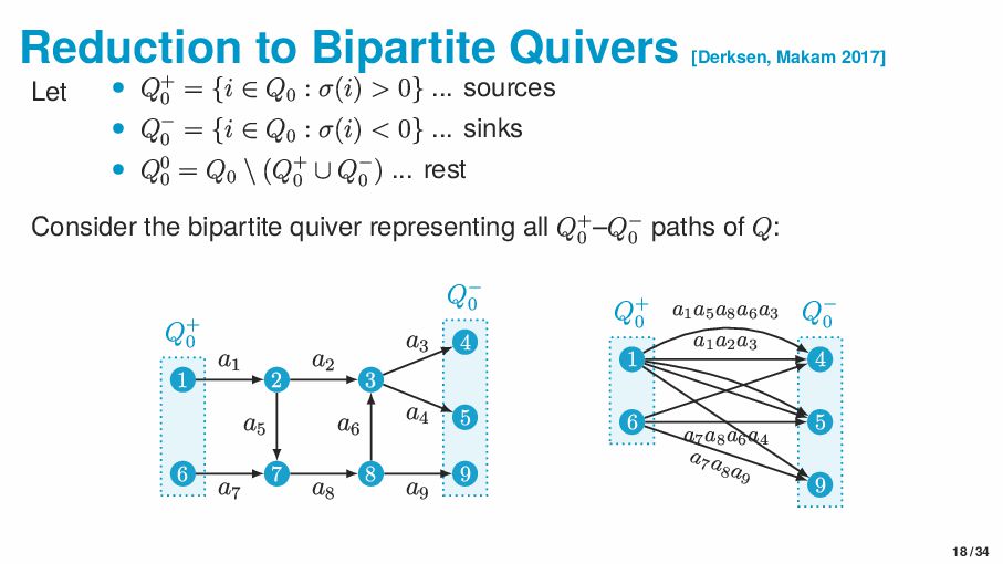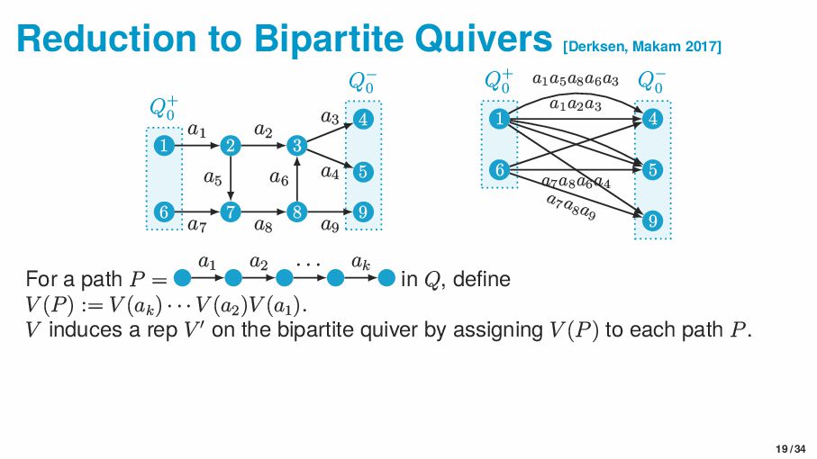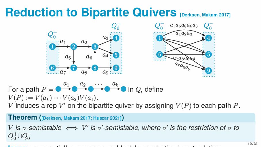 0 1 2 3 4 5 6 7 8 9 a1 a2 a3 a4 a7 a8 a9 a5 a6 Q+ 0 Q− 0 1 6 4 5 9 a1 a2 a3 a1 a5 a8 a6 a3 a7 a8 a6 a4 a 7a 8a 9 For a path P = a1 a2 · · · ak in Q, define V (P) := V (ak ) · · · V (a2 )V (a1 ). V induces a rep V ′ on the bipartite quiver by assigning V (P) to each path P. Theorem ([Derksen, Makam 2017; Huszar 2021]) V is σ-semistable ⇐⇒ V ′ is σ′-semistable, where σ′ is the restriction of σ to Q+ 0 ˙ ∪Q− 0 19 / 34