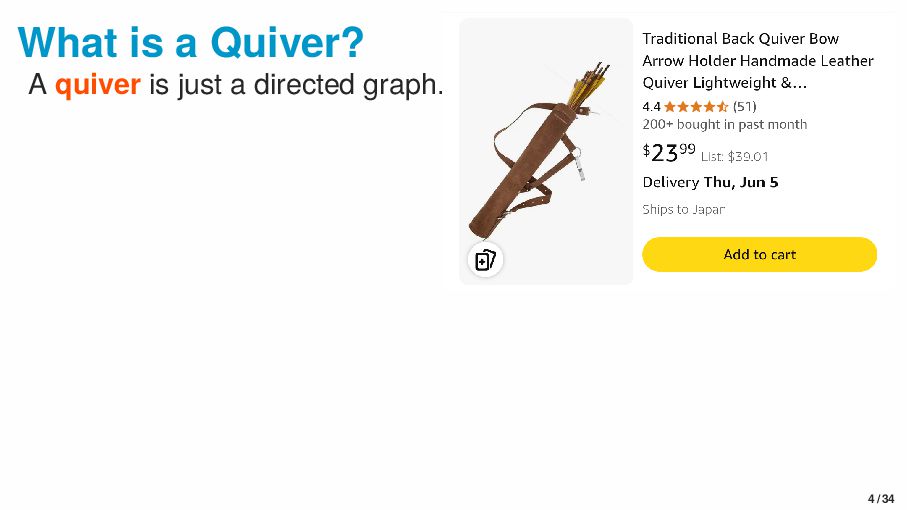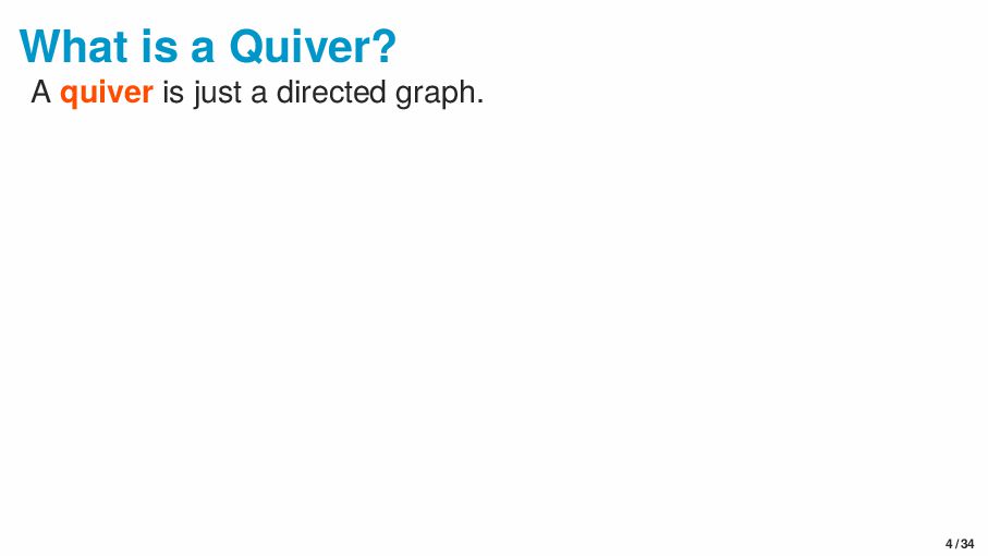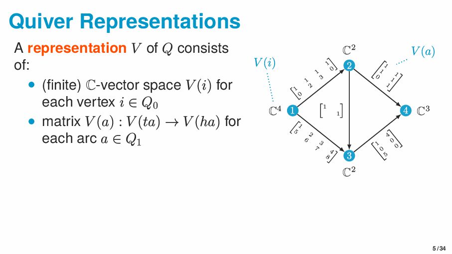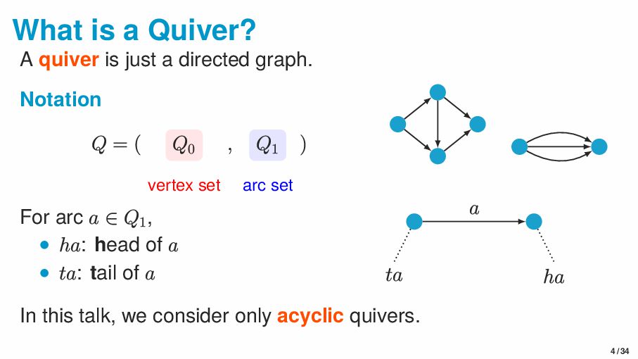 graph. Notation Q = ( Q0 vertex set , Q1 arc set ) For arc a ∈ Q1 , • ha: head of a • ta: tail of a a ta ha In this talk, we consider only acyclic quivers. 4 / 34