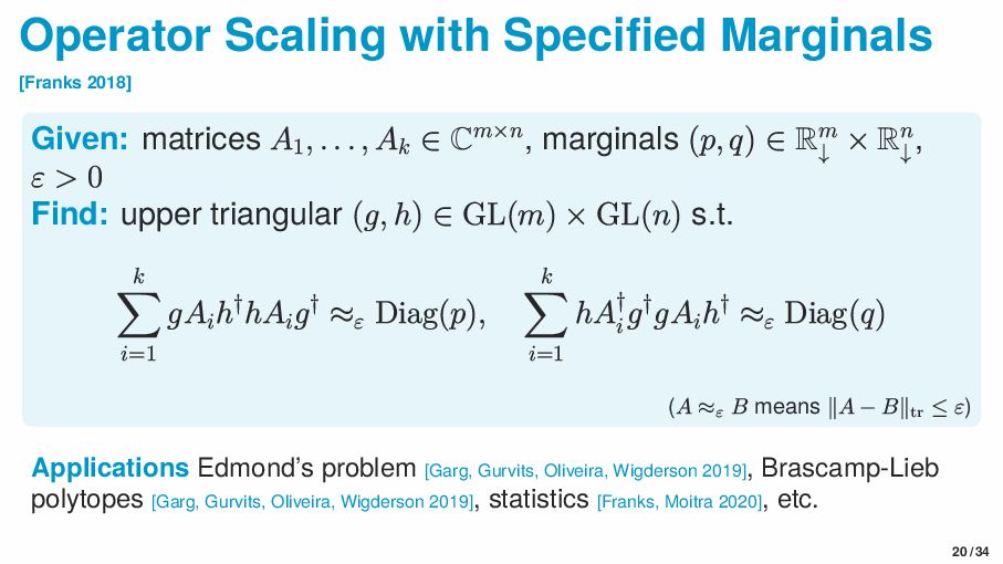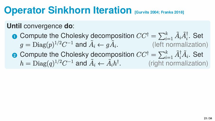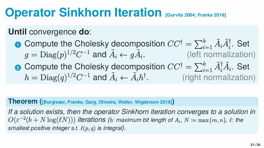 1 Compute the Cholesky decomposition CC† = k i=1 ˜ Ai ˜ A† i . Set g = Diag(p)1/2C−1 and ˜ Ai ← g ˜ Ai . (left normalization) 2 Compute the Cholesky decomposition CC† = k i=1 ˜ A† i ˜ Ai . Set h = Diag(q)1/2C−1 and ˜ Ai ← ˜ Ai h†. (right normalization) Theorem ([Burgisser, Franks, Garg, Oliveira, Walter, Wigderson 2018]) If a solution exists, then the operator Sinkhorn iteration converges to a solution in O(ε−2(b + N log(ℓN))) iterations (b: maximum bit length of Ai , N := max{m, n}, ℓ: the smallest positive integer s.t. ℓ(p, q) is integral). 21 / 34