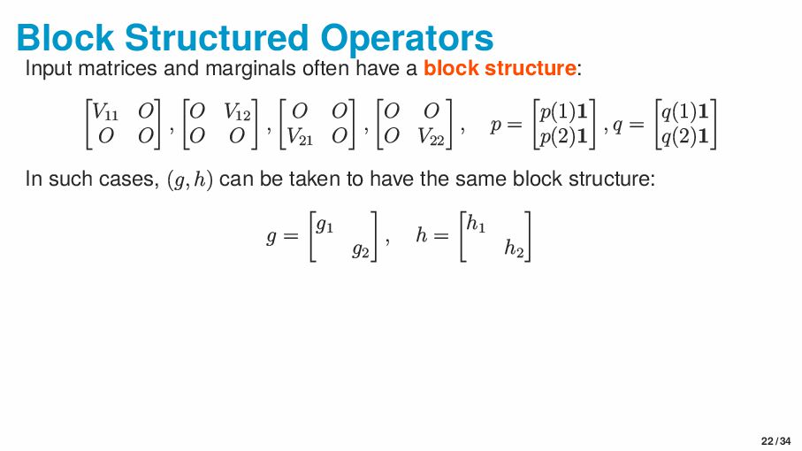 block structure: V11 O O O , O V12 O O , O O V21 O , O O O V22 , p = p(1)1 p(2)1 , q = q(1)1 q(2)1 In such cases, (g, h) can be taken to have the same block structure: g = g1 g2 , h = h1 h2 22 / 34