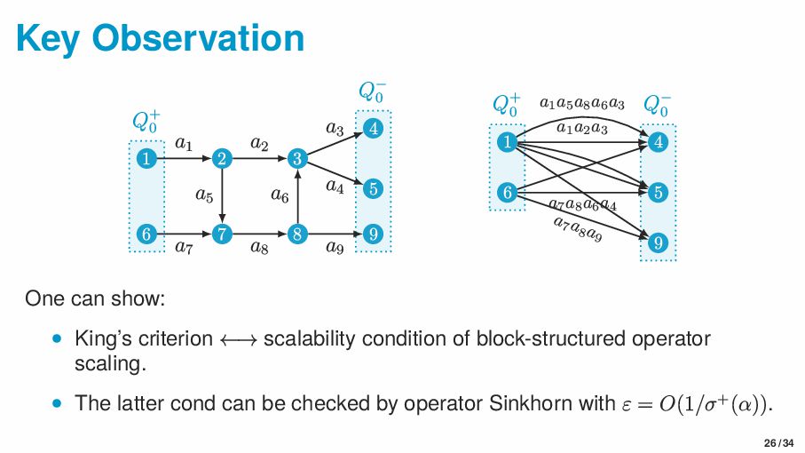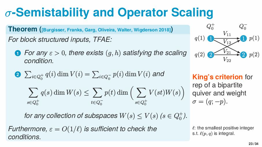 Wigderson 2018]) For block structured inputs, TFAE: 1 For any ε > 0, there exists (g, h) satisfying the scaling condition. 2 i∈Q+ 0 q(i) dim V (i) = i∈Q− 0 p(i) dim V (i) and s∈Q+ 0 q(s) dim W(s) ≤ t∈Q− 0 p(t) dim s∈Q+ 0 V (st)W(s) for any collection of subspaces W(s) ≤ V (s) (s ∈ Q+ 0 ). Furthermore, ε = O(1/ℓ) is sufficient to check the conditions. 1 2 1 2 q(1) q(2) p(1) p(2) Q+ 0 Q− 0 V11 V12 V21 V22 King’s criterion for rep of a bipartite quiver and weight σ = (q; −p). ℓ: the smallest positive integer s.t. ℓ(p, q) is integral. 23 / 34