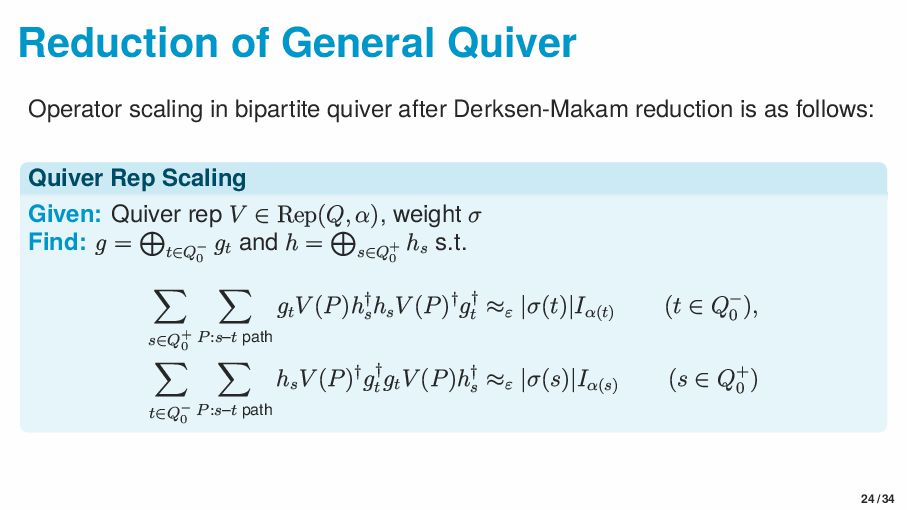 Derksen-Makam reduction is as follows: Quiver Rep Scaling Given: Quiver rep V ∈ Rep(Q, α), weight σ Find: g = t∈Q− 0 gt and h = s∈Q+ 0 hs s.t. s∈Q+ 0 P:s–t path gt V (P)h† s hs V (P)†g† t ≈ε |σ(t)|Iα(t) (t ∈ Q− 0 ), t∈Q− 0 P:s–t path hs V (P)†g† t gt V (P)h† s ≈ε |σ(s)|Iα(s) (s ∈ Q+ 0 ) 24 / 34