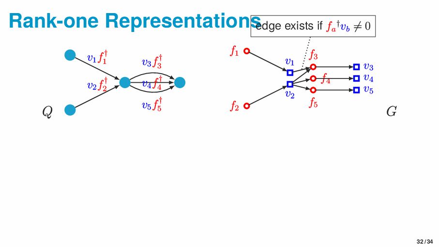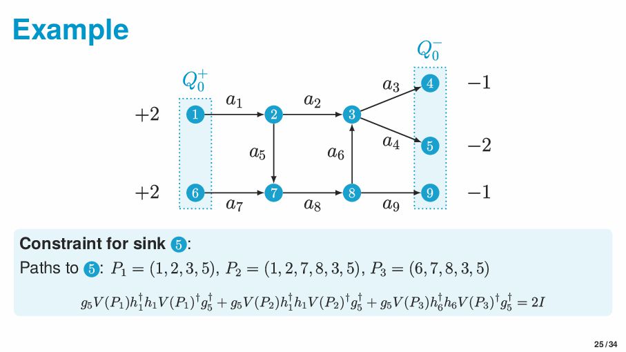 compute matrix sum-products over s–t paths: s∈Q+ 0 P:s–t path gt V (P)h† s hs V (P)†g† t for t ∈ Q− 0 and vice versa. How can we compute it in polytime? Observation This matrix sum-products can be computed in a bottom up manner in acyclic quivers. 1 2 3 4 a1 a3 a2 X1 ← h1 h† 1 X2 ← h2 h† 2 X3 ← V (a1 )X1 V (a1 )† +V (a2 )X2 V (a2 )† X4 ← V (a3 )X3 V (a3 )† desired matrix sum-product! 27 / 34
