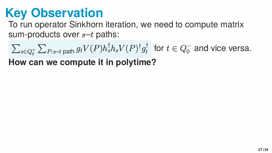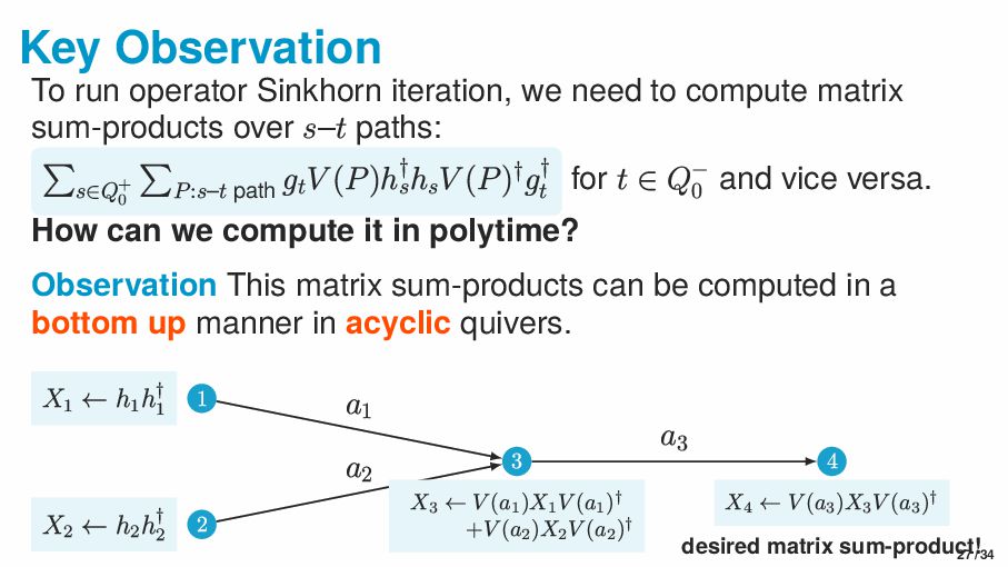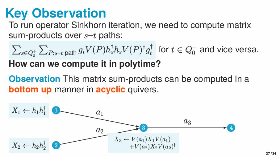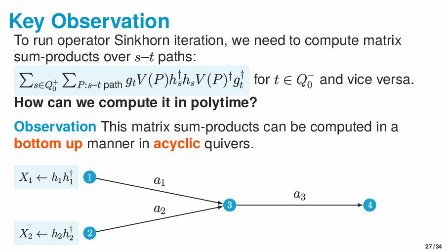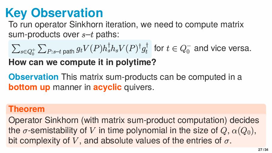 compute matrix sum-products over s–t paths: s∈Q+ 0 P:s–t path gt V (P)h† s hs V (P)†g† t for t ∈ Q− 0 and vice versa. How can we compute it in polytime? Observation This matrix sum-products can be computed in a bottom up manner in acyclic quivers. Theorem Operator Sinkhorn (with matrix sum-product computation) decides the σ-semistability of V in time polynomial in the size of Q, α(Q0 ), bit complexity of V , and absolute values of the entries of σ. 27 / 34