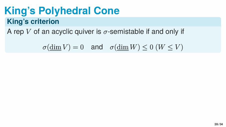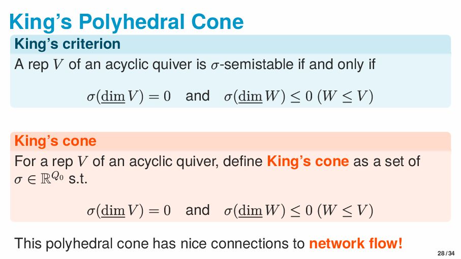 acyclic quiver is σ-semistable if and only if σ(dim V ) = 0 and σ(dim W) ≤ 0 (W ≤ V ) King’s cone For a rep V of an acyclic quiver, define King’s cone as a set of σ ∈ RQ0 s.t. σ(dim V ) = 0 and σ(dim W) ≤ 0 (W ≤ V ) This polyhedral cone has nice connections to network flow! 28 / 34