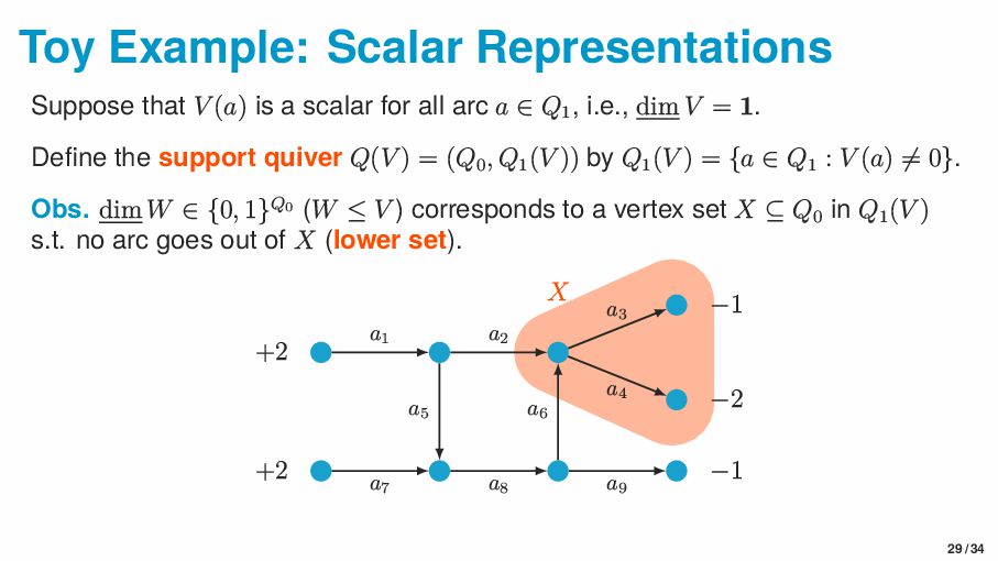 scalar for all arc a ∈ Q1 , i.e., dim V = 1. Define the support quiver Q(V ) = (Q0 , Q1 (V )) by Q1 (V ) = {a ∈ Q1 : V (a) ̸= 0}. Obs. dim W ∈ {0, 1}Q0 (W ≤ V ) corresponds to a vertex set X ⊆ Q0 in Q1 (V ) s.t. no arc goes out of X (lower set). X a1 a2 a3 a4 a7 a8 a9 a5 a6 +2 +2 −1 −2 −1 29 / 34