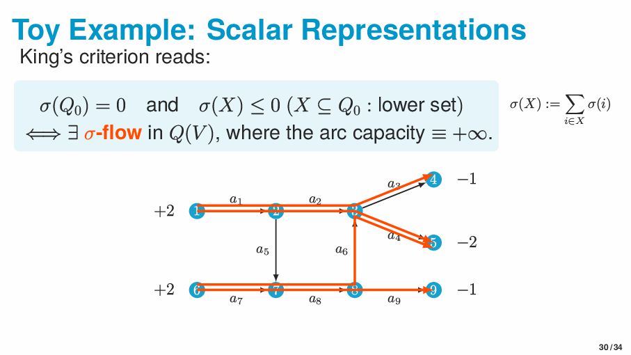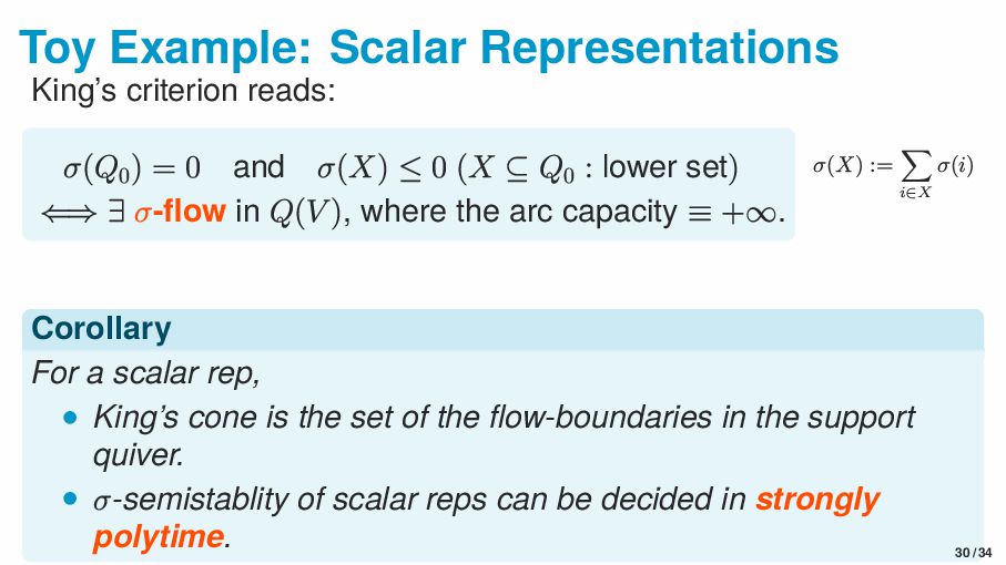 0 and σ(X) ≤ 0 (X ⊆ Q0 : lower set) ⇐⇒ ∃ σ-flow in Q(V ), where the arc capacity ≡ +∞. σ(X) := i∈X σ(i) Corollary For a scalar rep, • King’s cone is the set of the flow-boundaries in the support quiver. • σ-semistablity of scalar reps can be decided in strongly polytime. 30 / 34