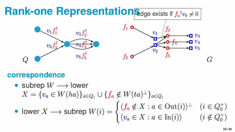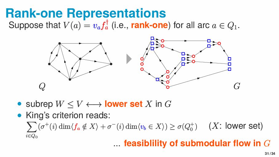 (i.e., rank-one) for all arc a ∈ Q1 . Q G • subrep W ≤ V ←→ lower set X in G • King’s criterion reads: i∈Q0 (σ+(i) dim⟨fa / ∈ X⟩ + σ−(i) dim⟨vb ∈ X⟩) ≥ σ(Q+ 0 ) (X: lower set) ... feasiblility of submodular flow in G 31 / 34